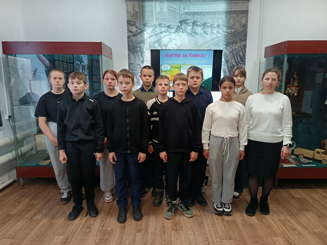 В рамках встречи, которая прошла в Зале войны, ребята увидели историческую хронику и данные об этапах и главных страницах битвы за Кавказ.