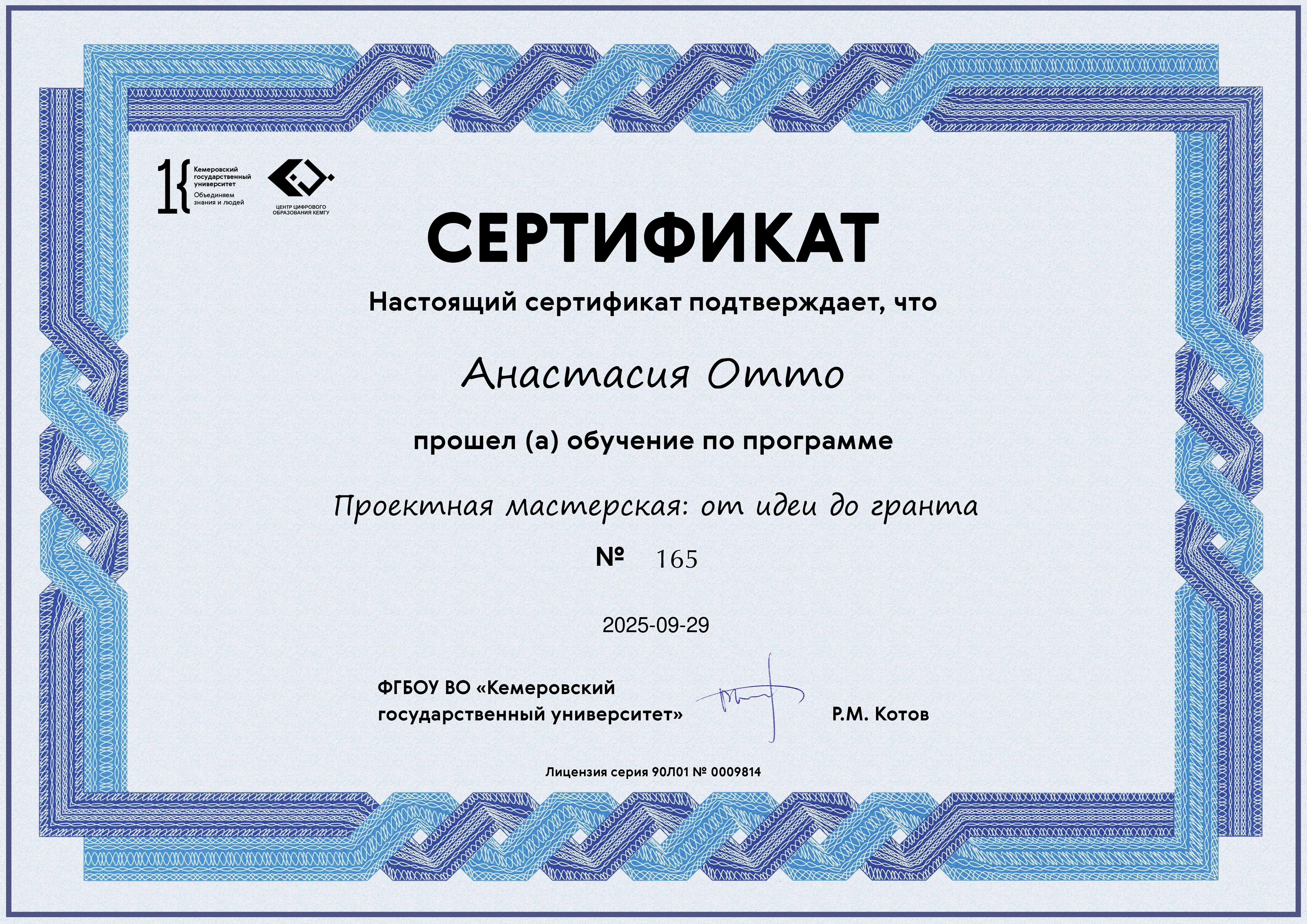 В сентябре 2025 года младший научный сотрудник Муниципального учреждения культуры «Ижморский краеведческий музей» прошла очередное обучение - дистанционный образовательный курс "Проектная мастерская: от идеи до гранта", организованный на платформе CIFRIUM.